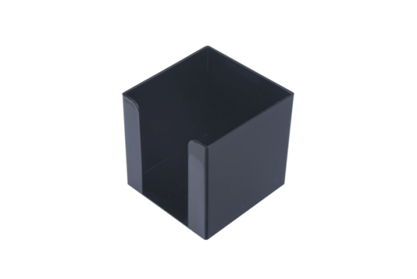 Бокс виготовлений з якісного пластика з вирізом для більш зручного використання паперового блоку, вміщує блок паперу для записів розміром до 9х9х9 см, колір непрозорий чорний