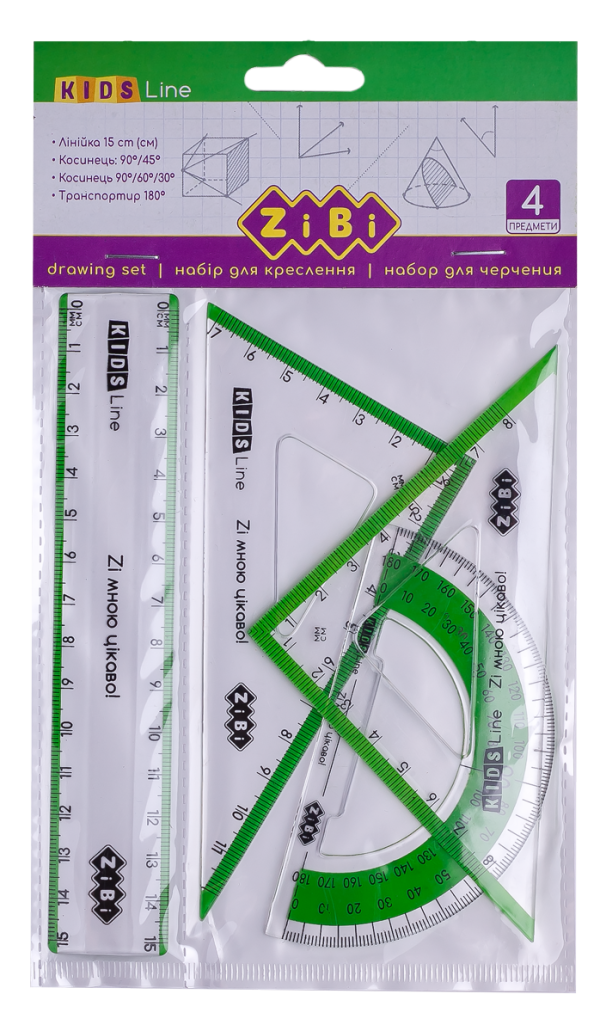 1 косинець 90°/60°/30° та лінійною шкалою вимірювань до 14 см із сантиметровими та міліметровими поділками;